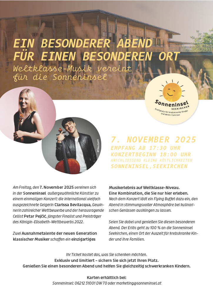 Seid dabei und genießt diesen besonderen Abend. Der Erlös geht zu 100 % an die Sonneninsel Seekirchen, einem Ort der Auszeit für krebskranke Kinder und ihre Familien.