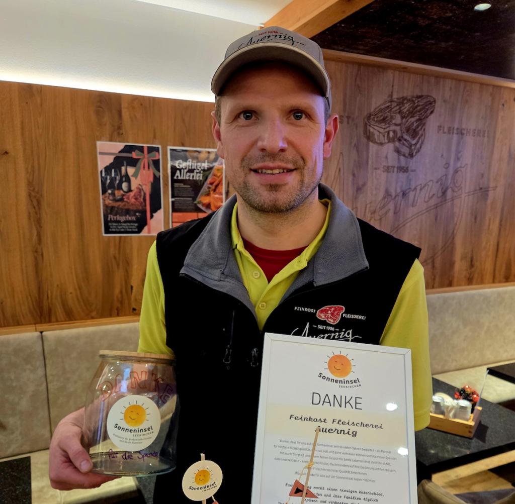 Darüber hinaus unterstützt die Feinkost Fleischerei Auernig die Sonneninsel auch laufend und bereits 2025 erneut mit einer Spende. Dieses verlässliche Mittragen bedeutet uns und den Familien auf der Sonneninsel sehr viel.