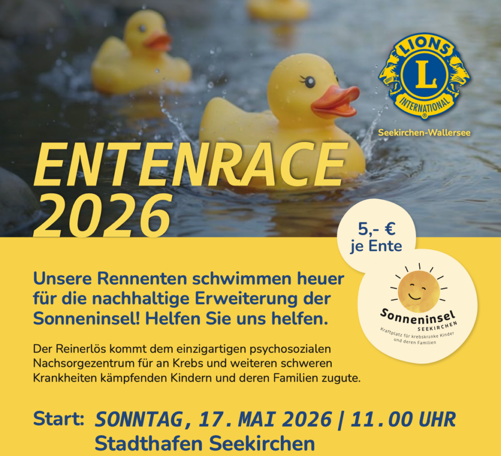 Auch heuer heißt es wieder: Daumen drücken, anfeuern und mitfiebern, wenn der Lions Club Seekirchen zum beliebten Entenrennen lädt! Wir freuen uns ganz besonders, dass die Rennenten 2026 für die nachhaltige Erweiterung der Sonneninsel ins Wasser gehen.